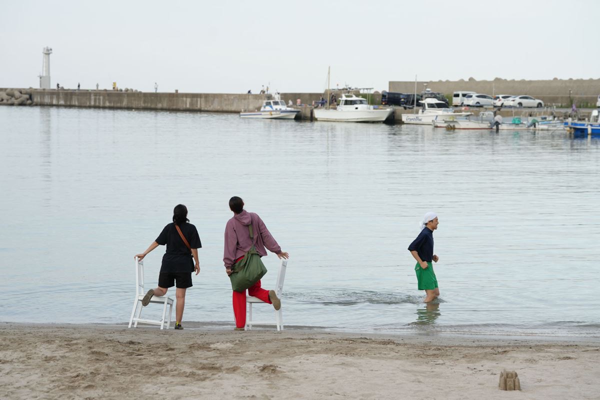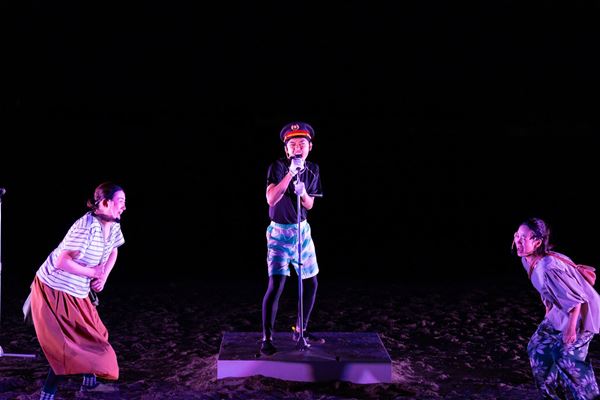 福原 テント劇のエキスパートである丸山厚人くんから、「海辺だけはとにかくやっちゃいけない」と言われていたんです。だから僕は二の足を踏んでいたんですが、劇団員に佐久間麻由という怖いもの知らずの人間がいまして……(笑)。よし、やろうと決めたものの、やはり大変は大変でした。浜辺の許可取りはもちろん、アシカショーで使うような防水のマイクを用意してもらったり、プロ用の天気予報サイトを見ながら雷雨に怯えたり。