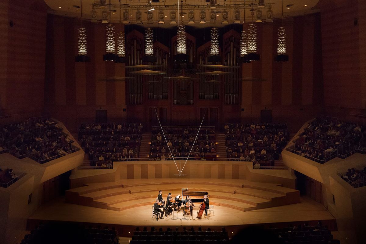 『反田恭平withベルリン・ソロイスツ』は、反田のピアノ独奏と室内楽のハイブリッド公演。「ベルリン・ソロイスツ」として来日したのは、ベルリン・フィルハーモニー・ホールの設計者の名前を冠した「シャルーン・アンサンブル・ベルリン」からの4人。ヴァイオリンのヴォルフラム・ブランドルは、元ベルリン・フィル奏者であり、現在はベルリン・シュターツカペレのコンサートマスターを務め、ヴィオラのミカ・アフカムはベルリン・フィルのメンバー、チェロのクラウディオ・ボルケスは、1995年のジュネーヴ国際コンクールで優勝し、ソリストとして活躍、コントラバスのピーター・リーゲルバウワーは元・ベルリン・フィルのメンバー、という名手揃い。