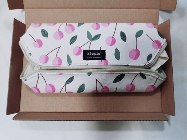 kippisのマルチケースは、白地にピンク色のさくらんぼのイラストがたっぷり描かれていて、とってもキュートなデザイン。中央には、「kippis」のロゴタグがついていて、愛らしさの中にクールさも感じられます。