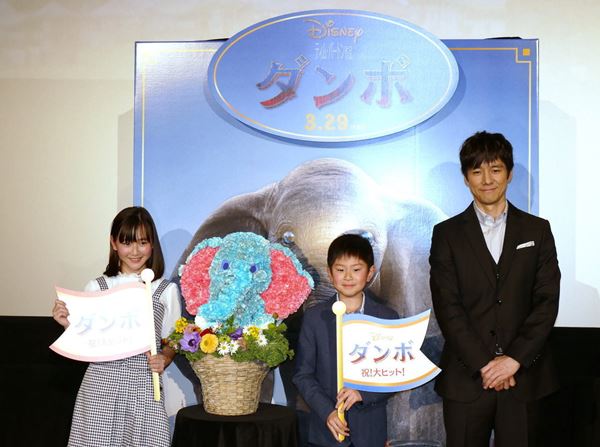 ディズニー・アニメーションの名作をベースに、ティム・バートン監督がオリジナル脚本で実写映画化した『ダンボ』の公開御礼舞台挨拶が4月3日、東京・TOHOシネマズ六本木ヒルズで行われ、吹替え版でダンボの命運を握るサーカス団員のホルトを演じ、ハリウッド作品の声優に初挑戦した西島秀俊、ホルトの子どもを演じた子役の遠藤璃菜(娘ミリー役)、岡部息吹(息子ジョー役)が出席した。