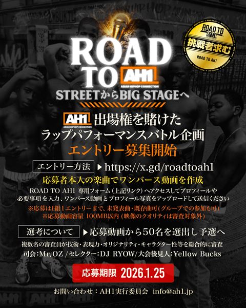また、『AH1』の会場内にて2011年よりスタートした子供達がストリートカルチャーを体験できる専用エリア「Kids Dream Project」や、2026年からスタートする『AH1』メインステージへの出場権を賭けた、ラップパフォーマンスのバトル企画『ROAD TO AH1』など注目のイベントも予定されている。ラップパフォーマンスのバトルイベントは、2月、3月、4月に愛知・BLACK NAGOYAにて開催。STREET で眠る若き無名の原石たちが、この戦いにより一夜にして全国へ名を轟かす。『AH1』メインステージへの出場権を賭けたSTREET からの挑戦が今、幕を開ける。夢の BIG STAGE へ駆け上がる瞬間を見逃すな。