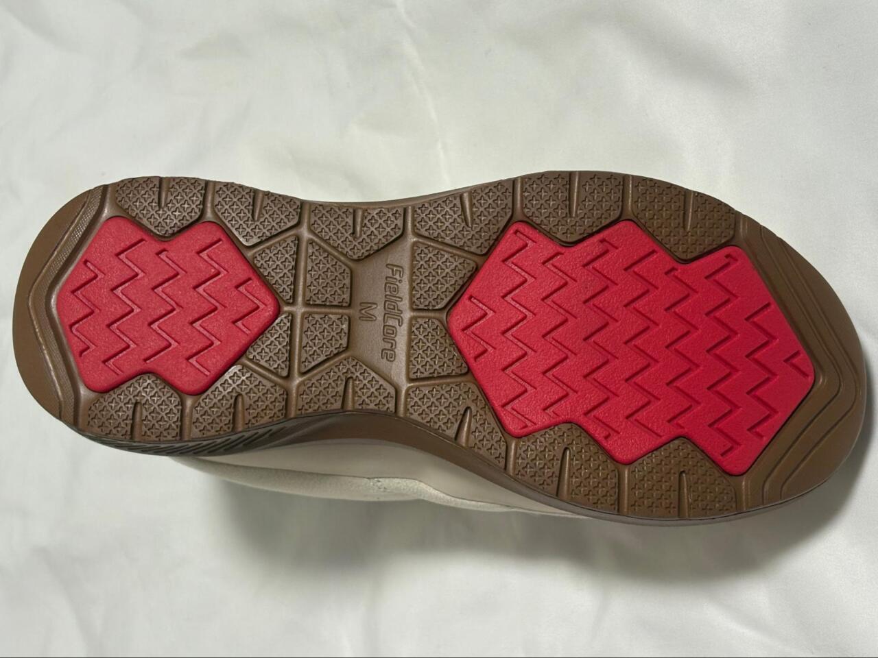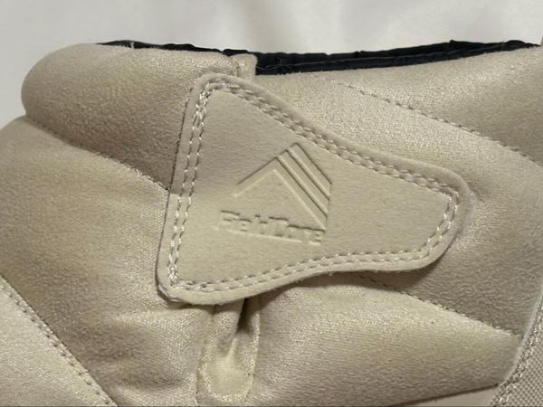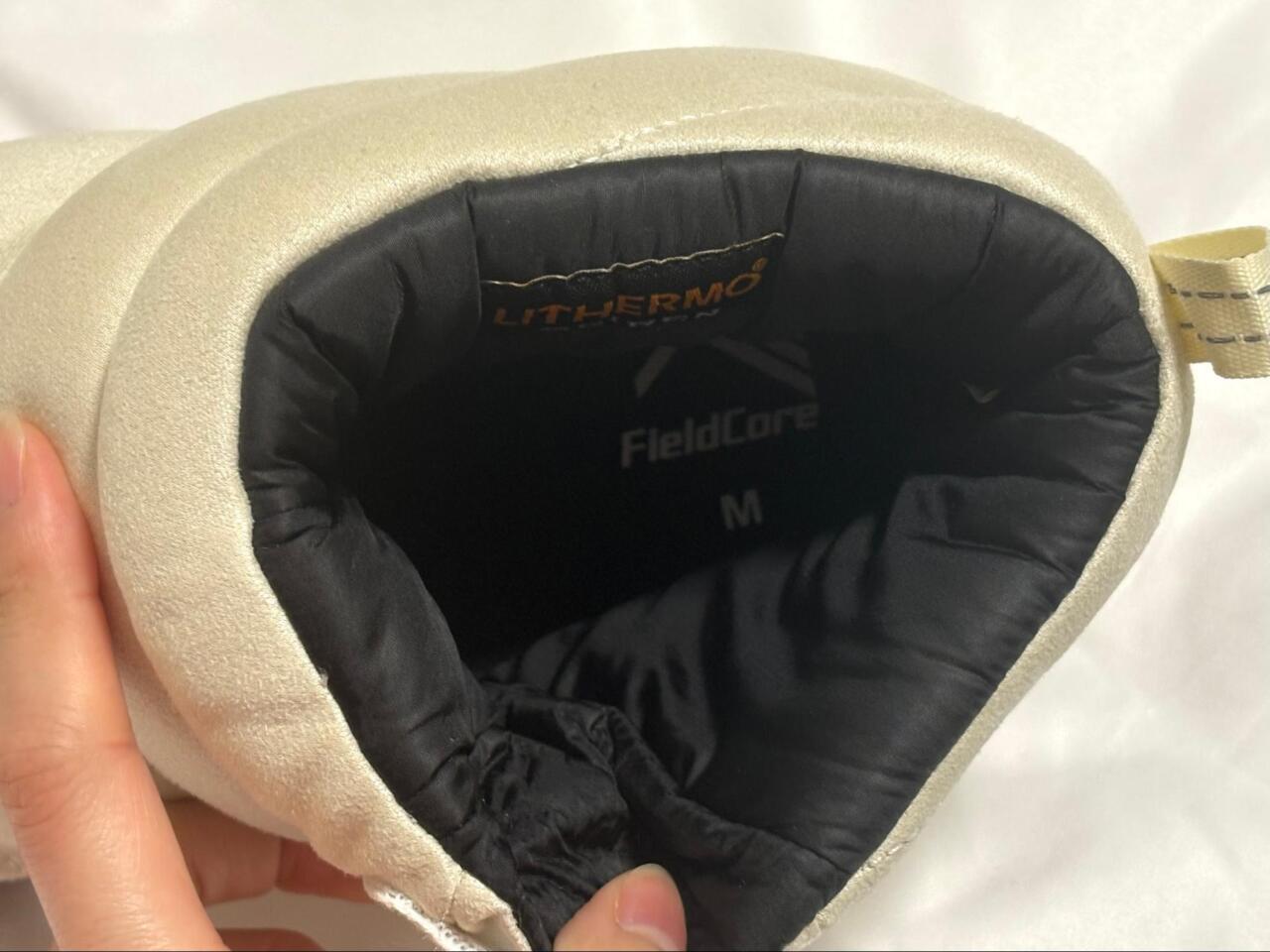 履き口はマジックテープになっており、脱ぎ履きしやすくフィット感を調整しやすいのが特徴。マジックテープ部分には「FieldCore」のロゴがありますが、オフホワイトは白、ブラックは黒で目立ちすぎず、おしゃれにまとまっているの嬉しいポイント◎