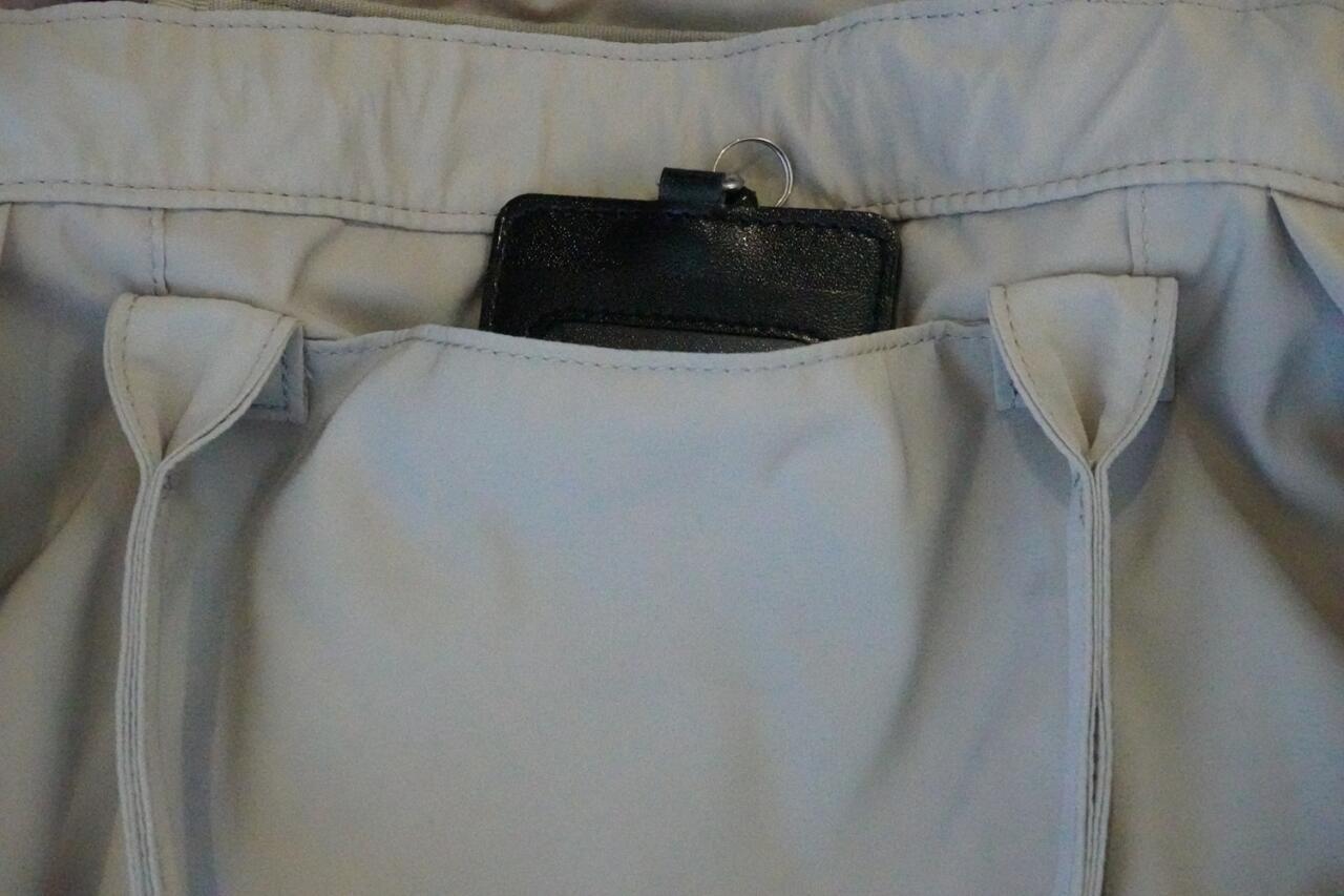 外側にはパッと見ではわからないポケットがあります。入れ口は狭いものの、中はスマホが横に入るほど横幅が広くとってあります。