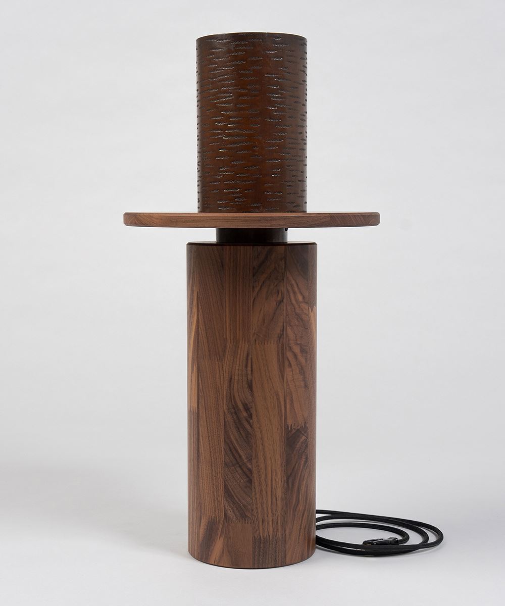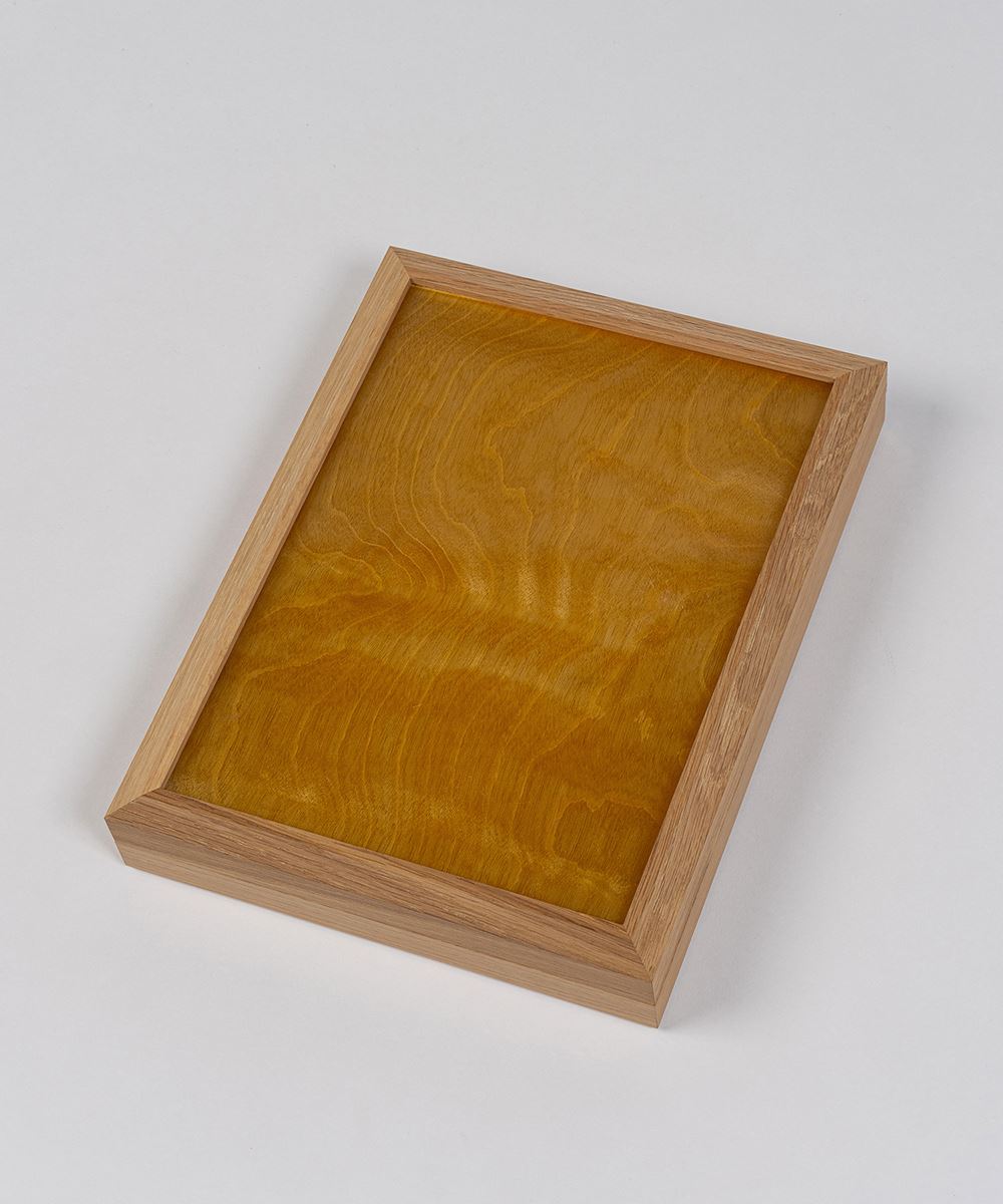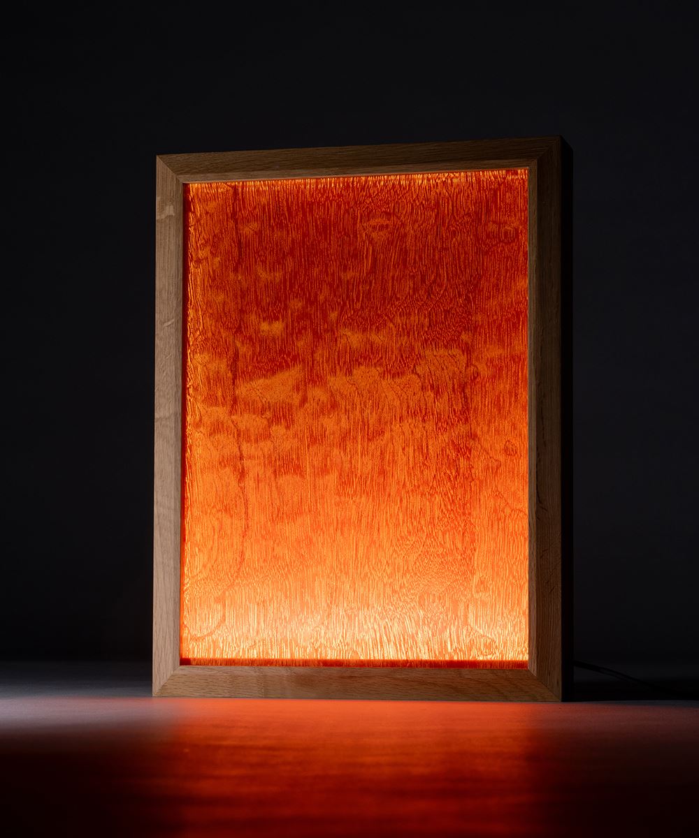 階段の手摺りを支えていた突板アクリル材は、照明とBOXの4アイテムへと活用。それぞれ、階段外側で使用されていたマホガニーと、内側で使用されていたトチの2種をラインナップしている。特に照明は、帝劇ロビーと同じく内側下部にライトを仕込み、ロビーの雰囲気を追求した上品な仕上がりとなった。