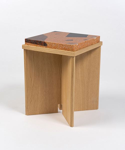 ロビー客席側の壁のレンガや、入口のガラス扉の欠片も余すことなく活用。ロビー柱の自然石も加え、まさに帝劇のレガシーをミックスした天板のローテーブルは、レガシーベージュとレガシーオレンジの2カラー展開となる。