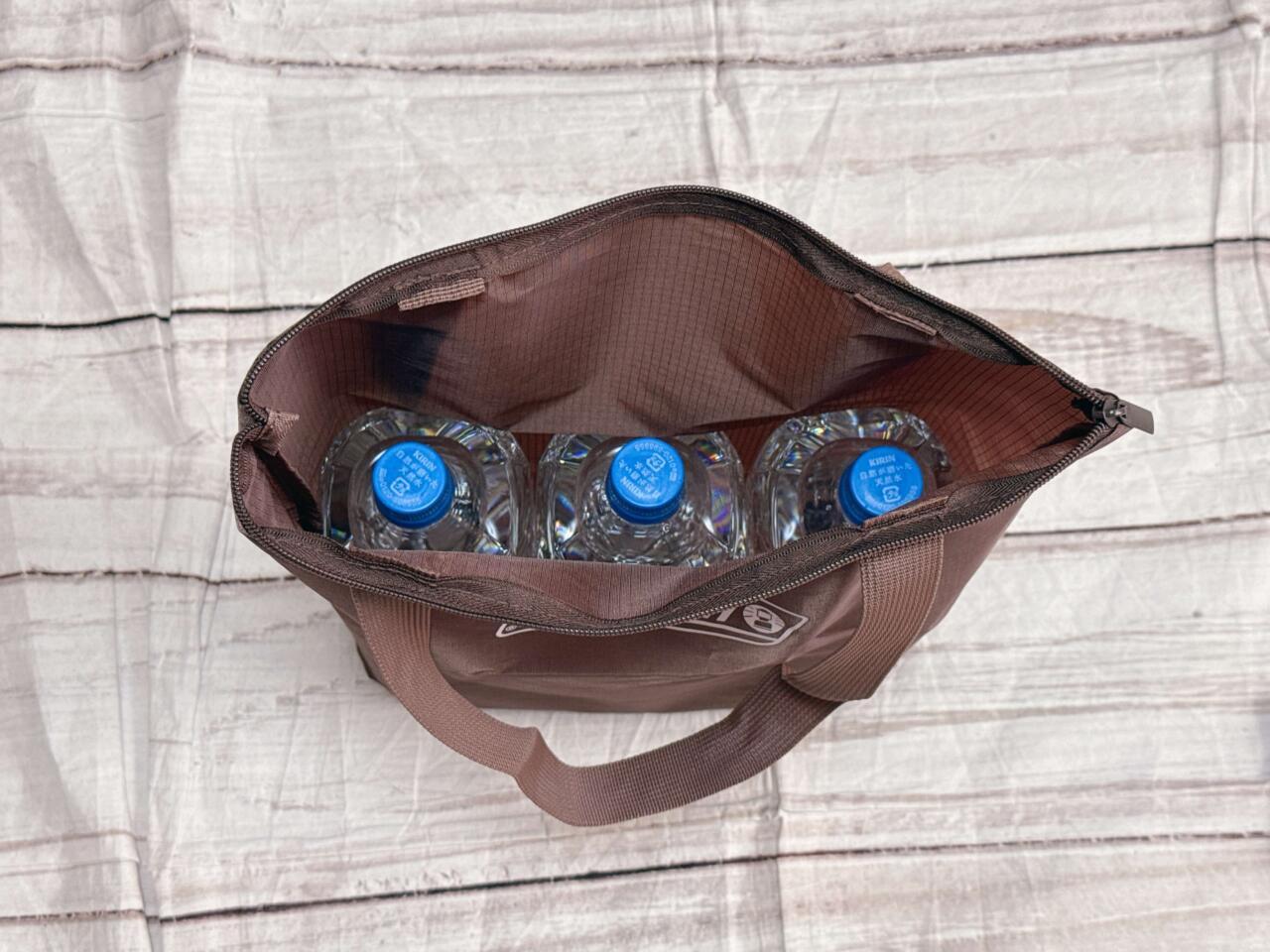 今回は、まずはエコバッグとして使うことを想定し、2LペットボトルをIn。2Lのペットボトルは3本収納することができました!大容量なため、週末のまとめ買いなどの際にも重宝しそうです。