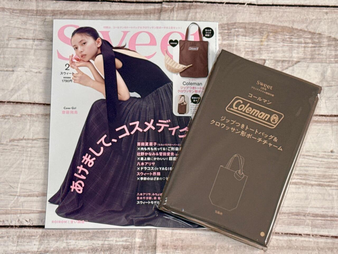 2026年1月9日に発売された雑誌『sweet(スウィート)』2月号には、大人気アウトドアブランドColeman(コールマン)の「トートバッグ&ポーチチャーム」が付録としてついてきます。
