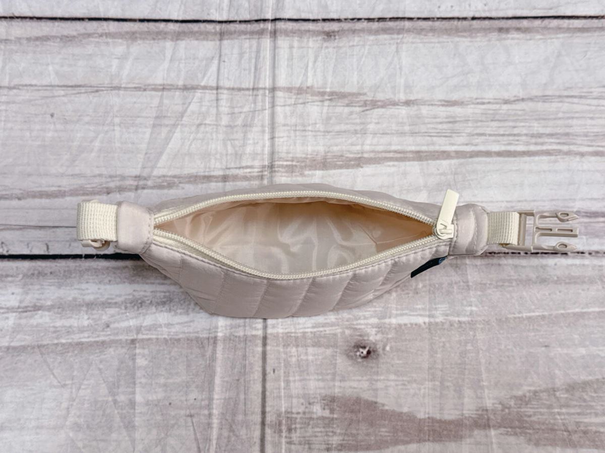 ポーチチャームの素材はポリエステル。上品な光沢感がある生地です。ダウンジャケット調の中綿入りの生地で、ふっくら感が◎。