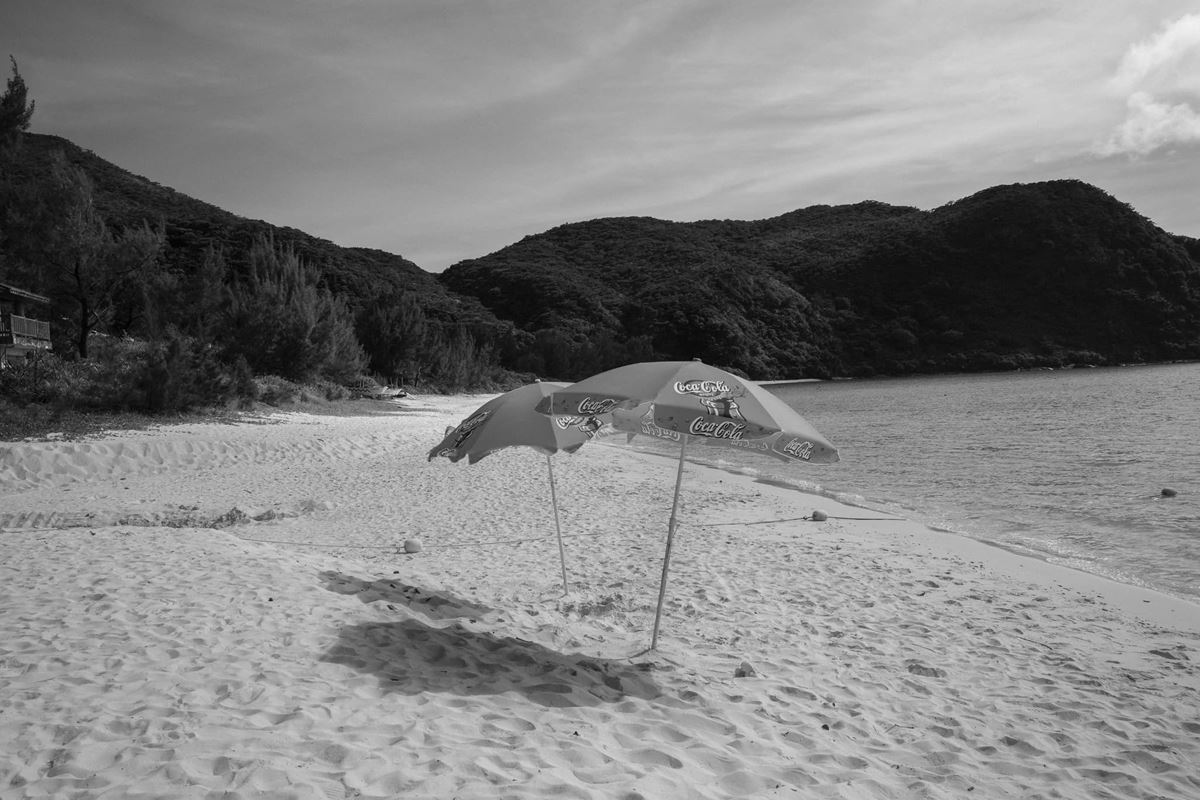 まず2016〜2022年に沖縄のあちらこちらを歩いて撮影したカラーのシリーズ「眠る木」と、初公開となるモノクロの新作「前の浜」を展示。「前の浜」では2025年に自室から慶良間諸島までの旅を撮影した約200枚のスライドショーと、その写真1点1点に付されたタイトルをたどりながらある日の旅に誘う。