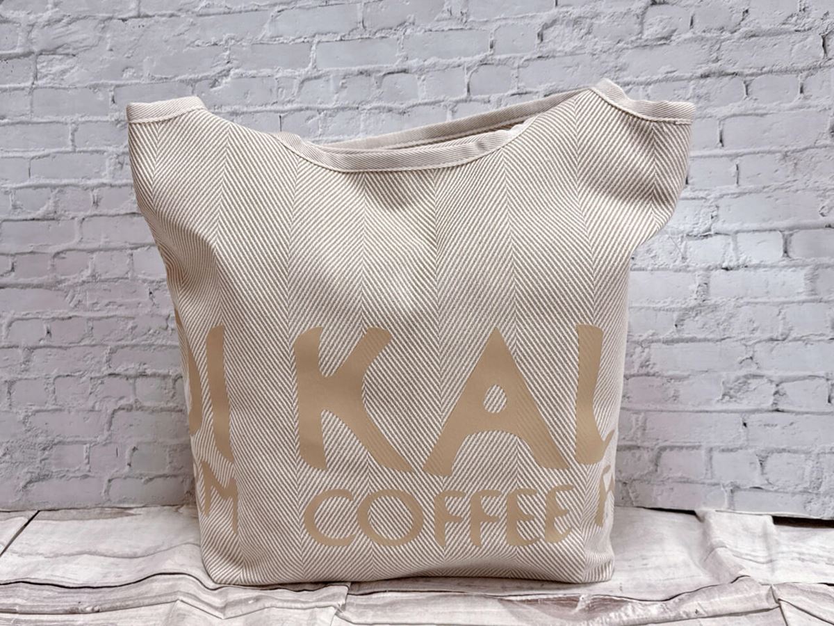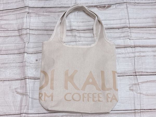 アイボリー×ベージュのヘリンボーン柄で、丈夫なだけでなく、おしゃれな点もうれしいポイント!バッグの前面下部には、「KALDI COFFEE FARM」のロゴがベージュでプリントされており、アクセントになっています。