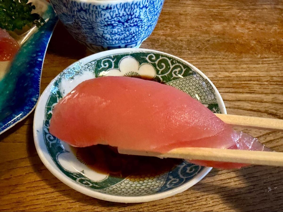 口の中に入れると、トロほど脂みがあるわけでもないけどしっかりコクがあり、噛むほどに旨みが静かに広がる味わいが広がります。身質はしっとりとしていながら水っぽさはなく、赤身らしい酸味とコクのバランスが良いですね。