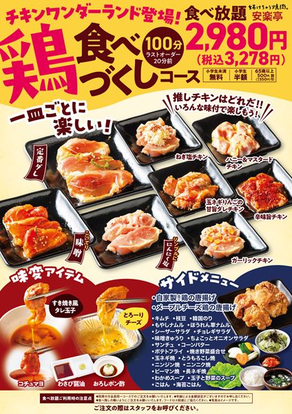 さらにすき焼き風タレ玉子やとろーりチーズ、コチュマヨなどの“味変アイテム”で、自分だけの「推しチキン」を探す楽しさも。ソフトドリンク付きでサイドメニューもしっかり楽しめるコースです。
