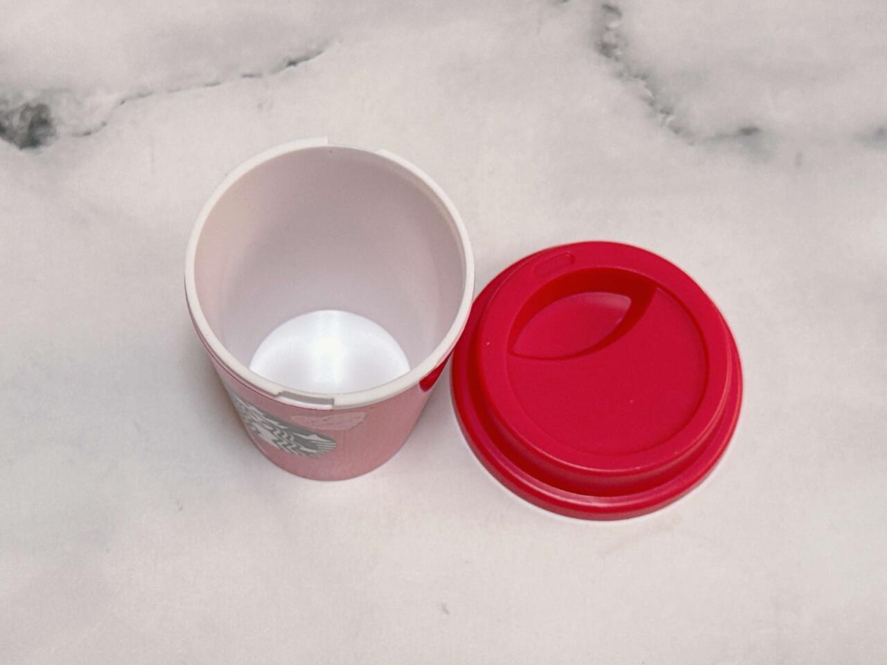 スタバのカップを模したミニチュアカップ。レッドに近いピンクカラーにハートと猫のモチーフのイラストがプリントされており、バレンタインのスウィートなムードを盛り上げるデザインが◎。