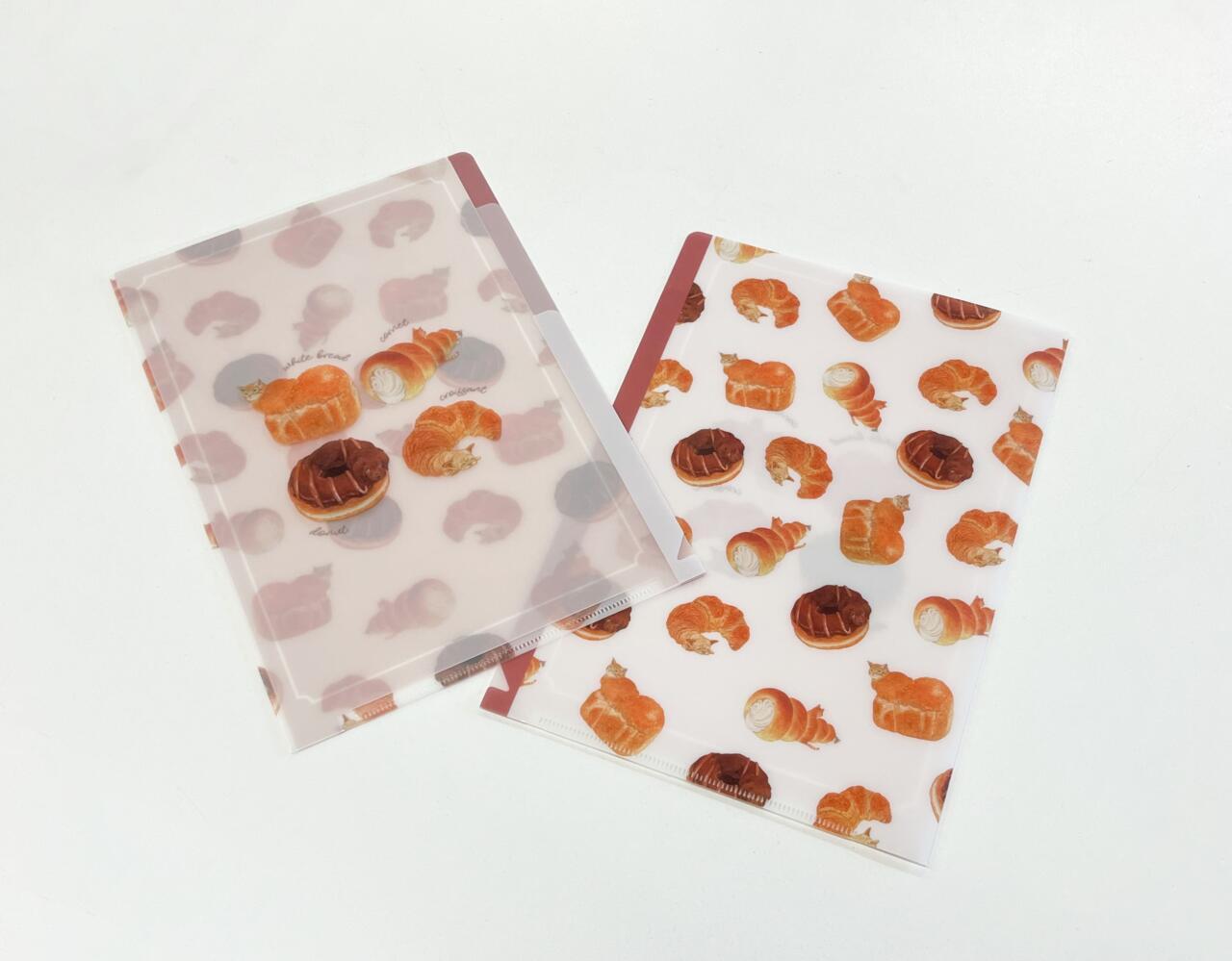 t.t.tohtoさんの「3ポケットA5クリアファイル パン」は、さまざまなパンの中にネコが隠れているイラストのクリアファイル。