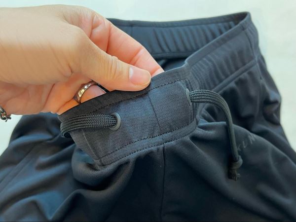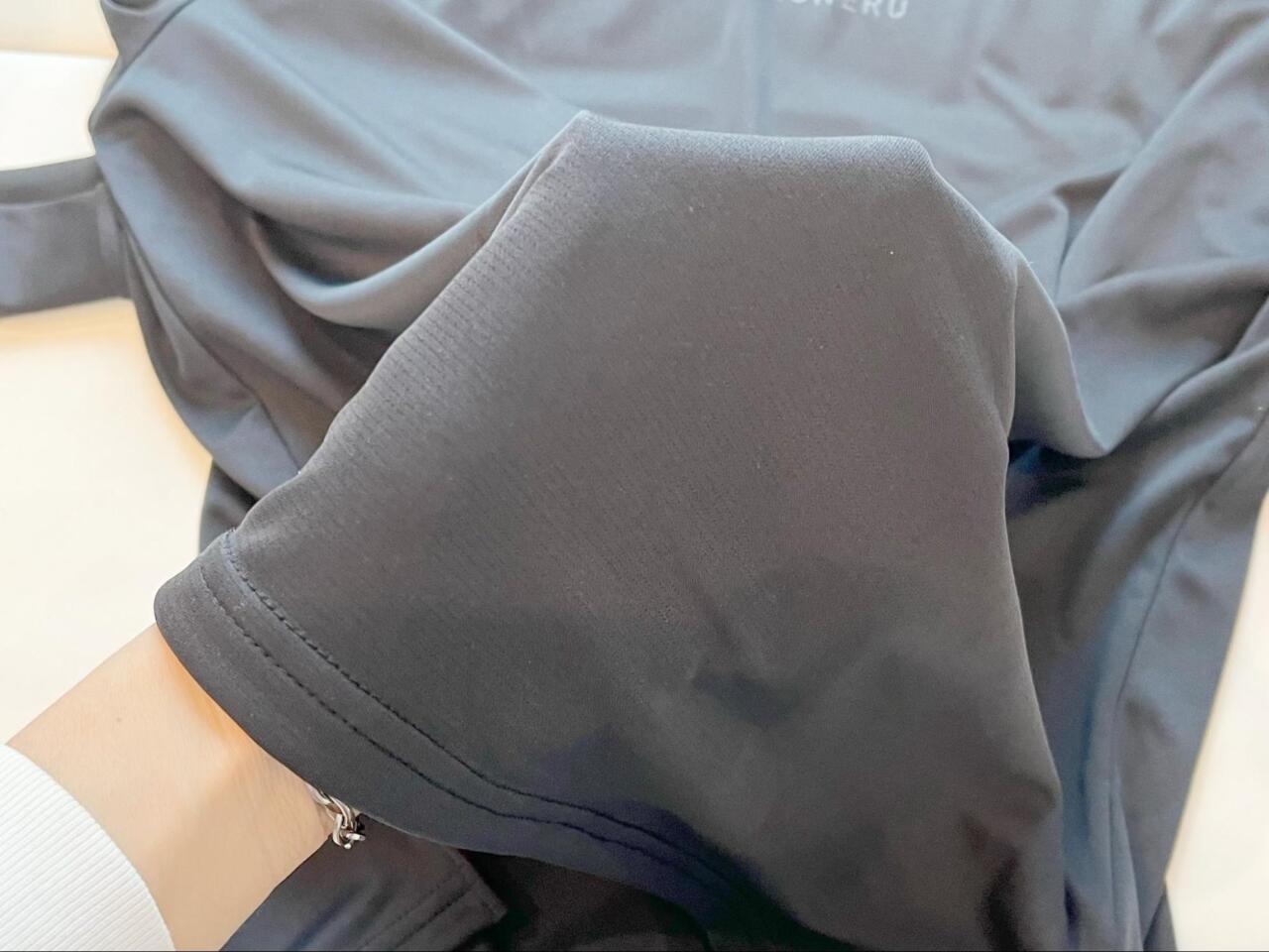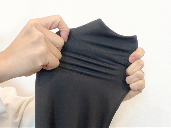 生地感はスポーツウェアのようなさらりとした手触り。縫い目が気にならない設計でストレッチ性が高く、幅広い体型にフィットしそうな印象です♪