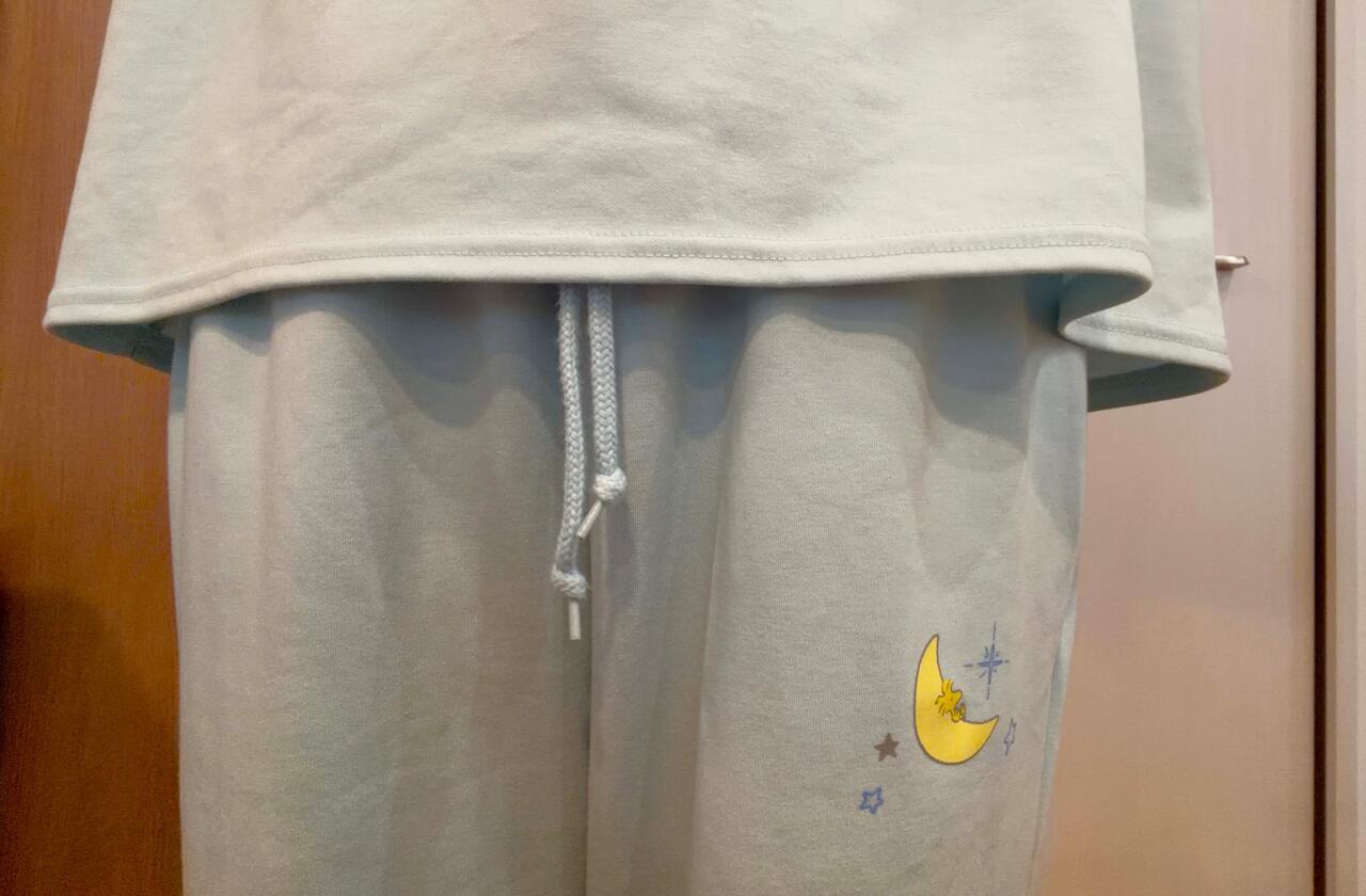 ボトムスの腰部分には、三日月の上でスヤスヤ眠るウッドストックのイラストをデザイン。