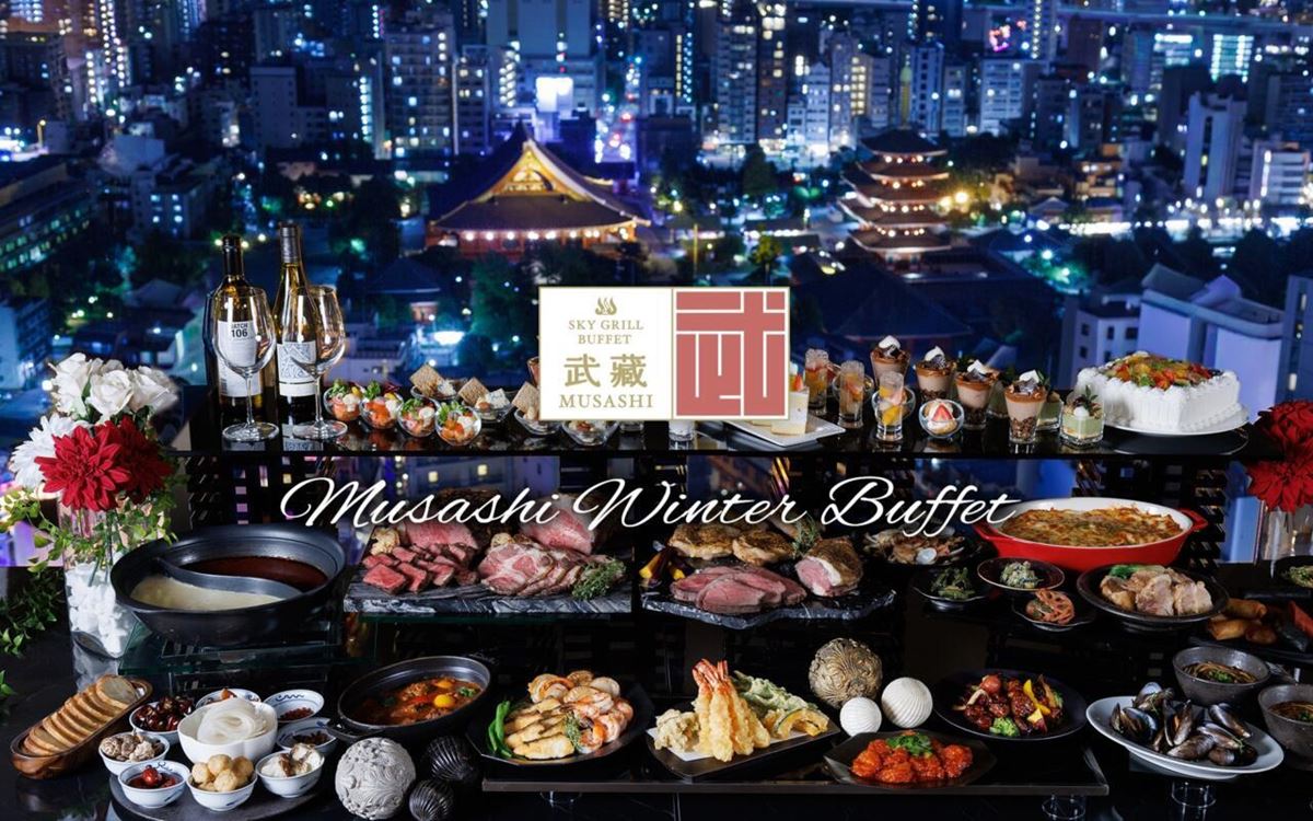 浅草ビューホテル内の「スカイグリルブッフェ 武藏」では、2026年1月4日(日)~2月28日(土)の期間、地上26階からの眺望と料理が楽しめる「ウインターブッフェ」が開催されています。