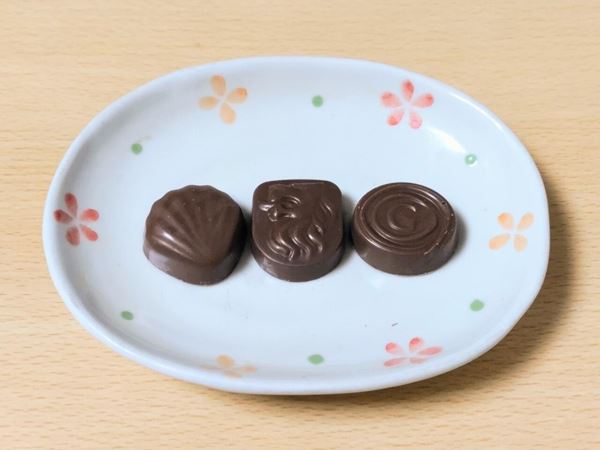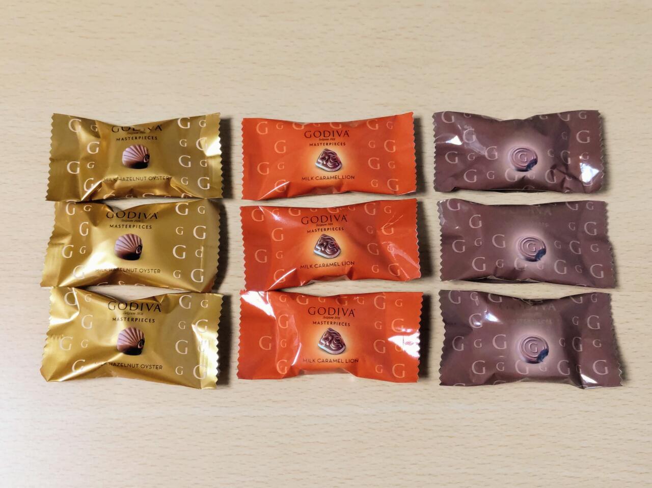 フレーバーは、プラリネ、キャラメル、ブリスの3種類で、いずれも表面はミルクチョコで包まれています。プラリネはオイスター(牡蠣)の貝殻、キャラメルはライオンの紋章、ブリスはゴディバの頭文字「G」をかたどったデザインです。