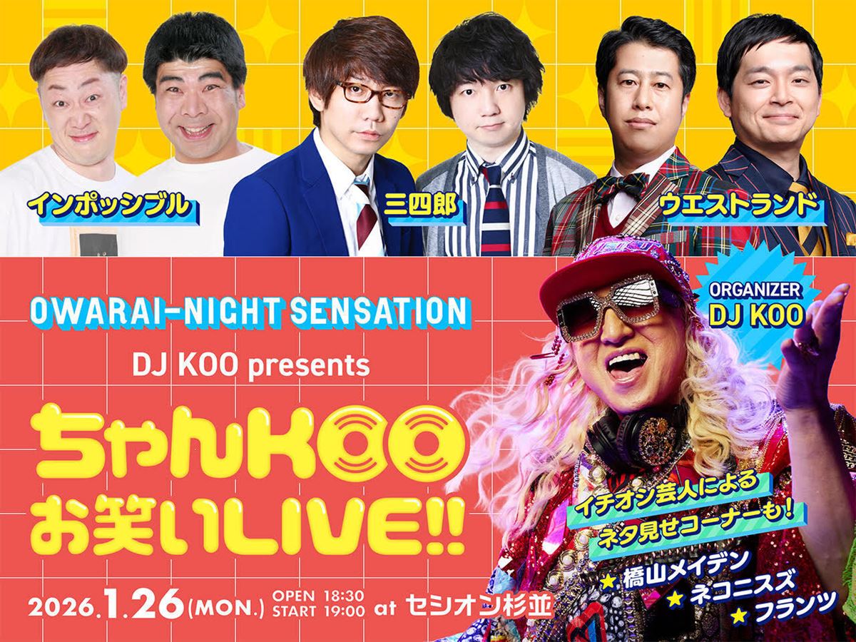 インポッシブル、三四郎、ウエストランドが出演する Owarai-night Sensation『DJ KOO presents ちゃんKOOお笑いLIVE!! vol.6』が、1月26日(月)にセシオン杉並で開催される。