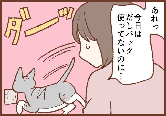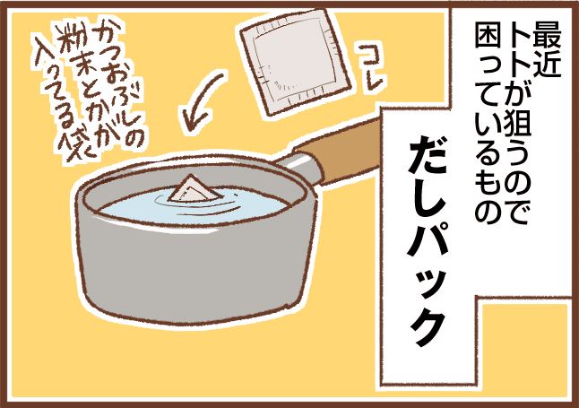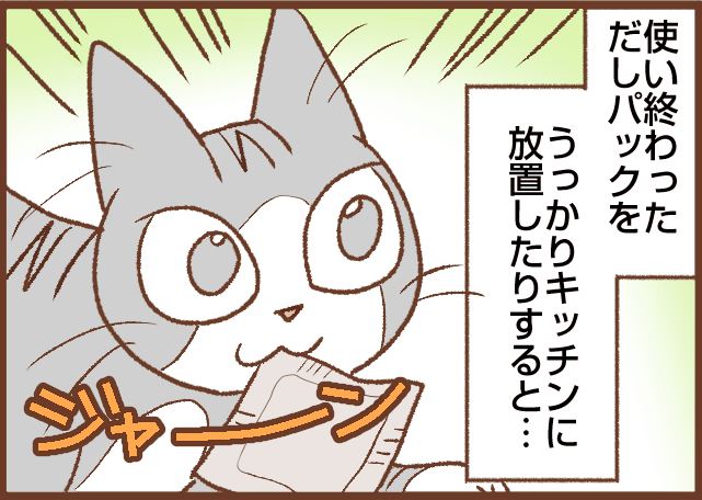 だしパックは中身をちょっと食べちゃったりもするので気をつけているのですが、本当に一瞬の隙でゴミ捨て場からサ~ッと持っていくことがあって全然私のスピードでは間に合わないという…。