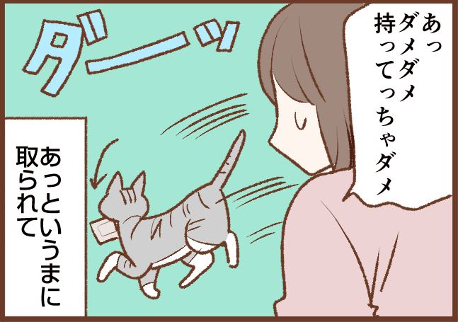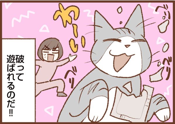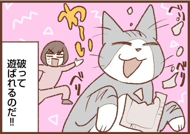 椅子や机の下に持って逃げて行って、そこでバリバリに破るのであとから掃除も大変です!!