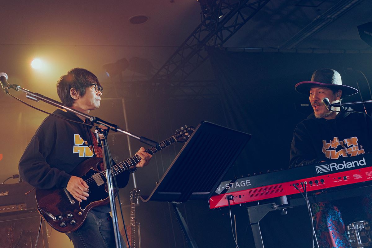「ザ・ライターズのテーマ!」鈴木がそう告げ、ついに宴がスタート。ステージもフロアも全員が笑顔で音楽を分かち合う中、続けて披露されたのはスキマスイッチのナンバー「フィクション」。大橋が歌うブルージーな嘆きを、鈴木のコーラスが光射す方に導いていく。「ザ・ライターズはスキマとフラカンの合体バンドです」(鈴木)、「僕ら全員、愛知県出身でフラカンは大先輩」(大橋)と、ザ・ライターズの成り立ちを交互に説明する鈴木と大橋。