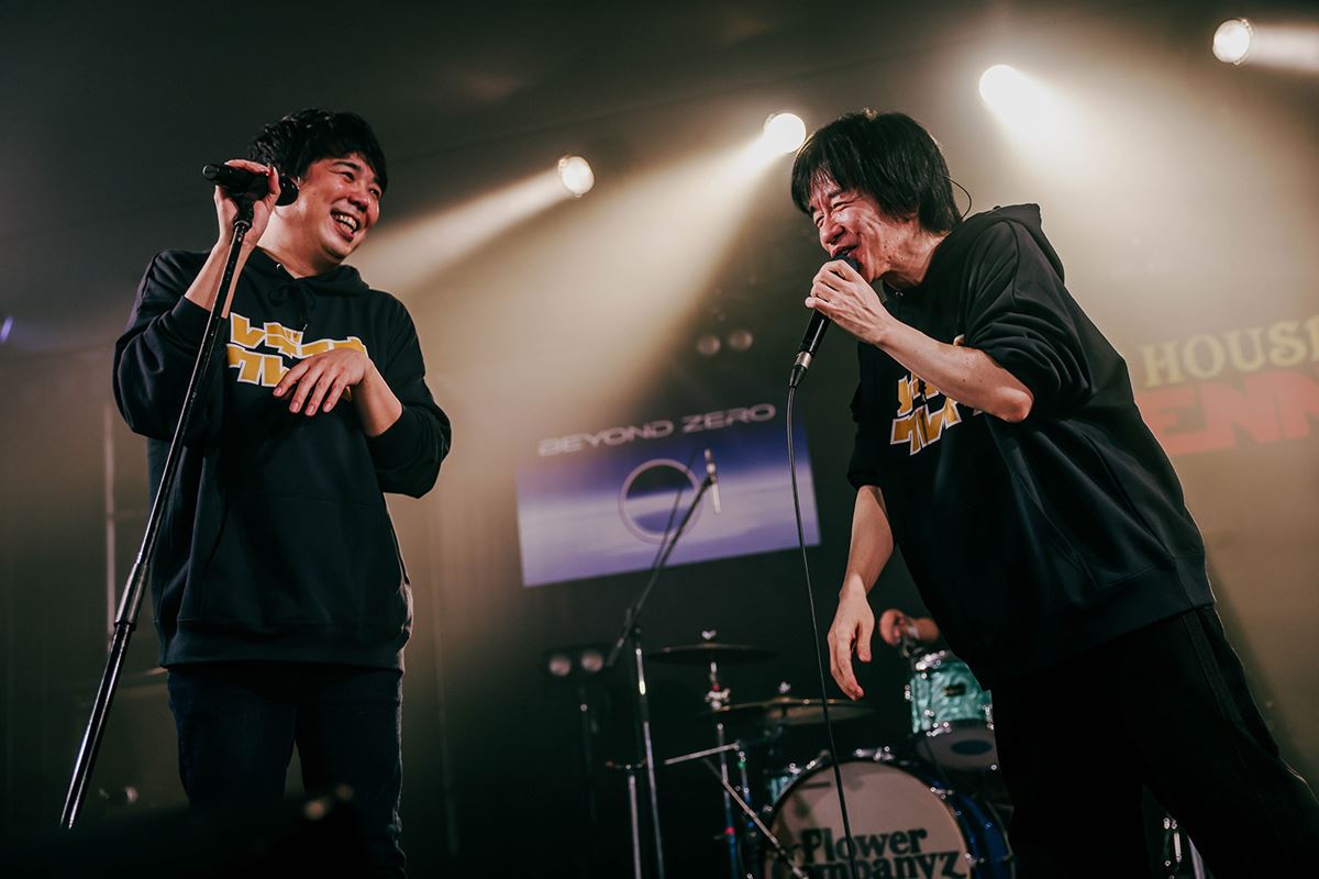 立て続けに披露された名曲2曲に涙ぐむ観客の姿がちらほら見える中、「ライターズは曲のリクエストにも、呼んでいただければホームパーティにも対応します。この熱量で2LDKでもやりますよ」と、グレートマエカワ。「いつかアリーナツアーをやりたい」と鈴木が夢を語ると、「スキマのお荷物になるから(笑)。まずはフェスとかイベントで」と、グレートが冷静に突っ込む。ほのぼのムードに包まれた場内に最後に響いたのは、フラカンの近年のキラーチューン「ラッコ!ラッコ!ラッコ!」。ラッコをイメージした鈴木の動きを見ながら大橋も一緒に振り付けをしたり、ラッコをそれぞれ好きな動物に変えて観客とコール&レスポンスしたりと、場内の熱気が一気に高まって、大団円でザ・ライターズのステージは終了。