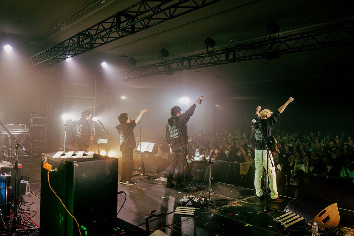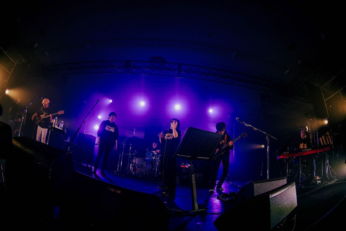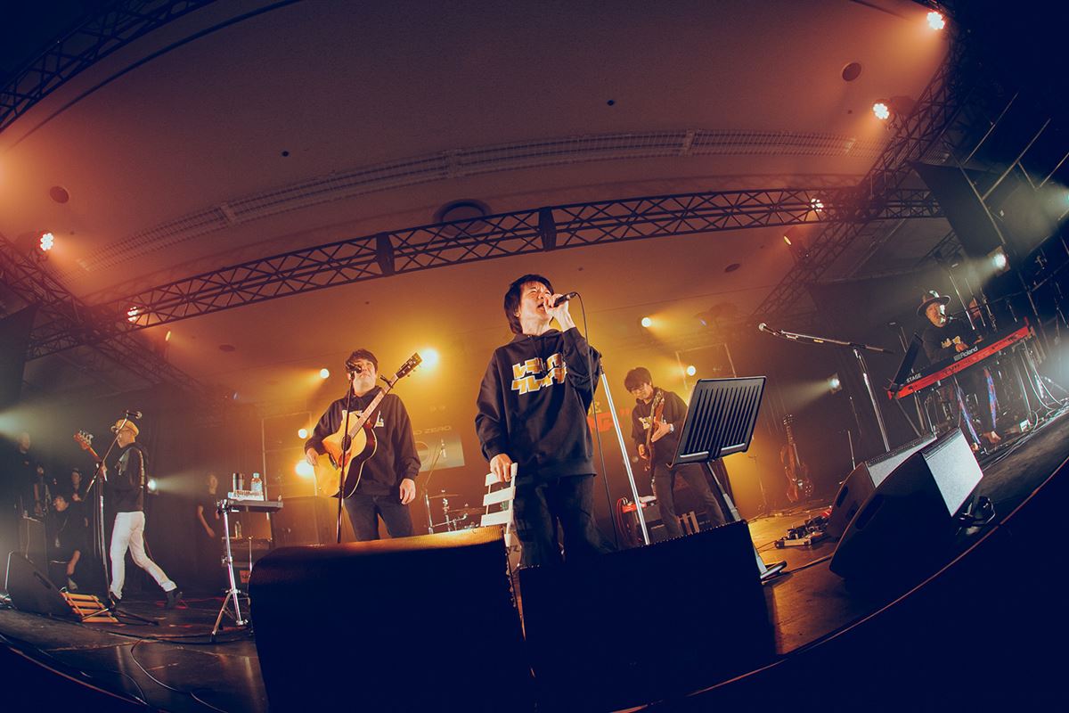 和気あいあいとしたMCの後、常田真太郎(key/cho)が響かせた「奏(かなで)」のピアノリフに、フロアから感動のどよめきがあがる。最初は大橋が、2番は鈴木、最後は大橋と鈴木がマイクリレーで歌い、ツインボーカルでサビを美しくハモる。ふたりの歌声と熱のこもったエモーショナルな演奏に釘付けになる観客の心をさらに揺さぶるように、青いライトが照らすステージから、フラカンの名曲「深夜高速」のギターリフが鳴り響く。