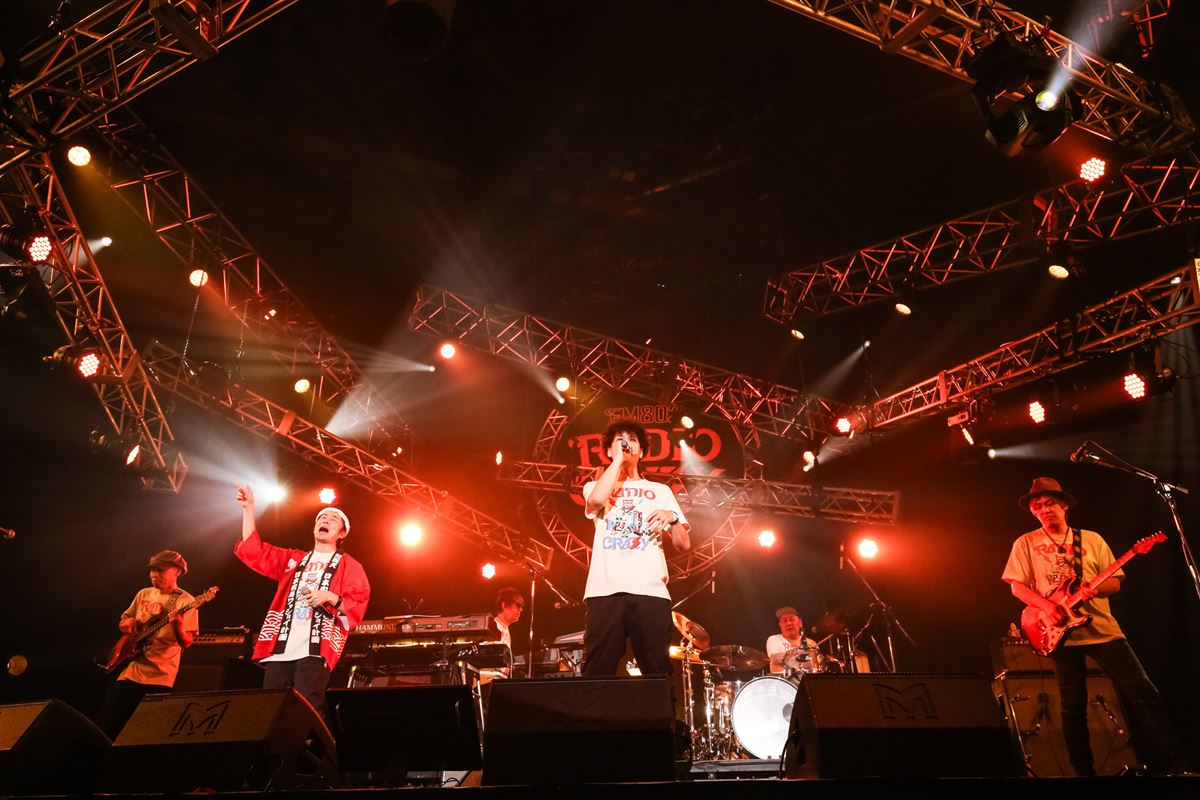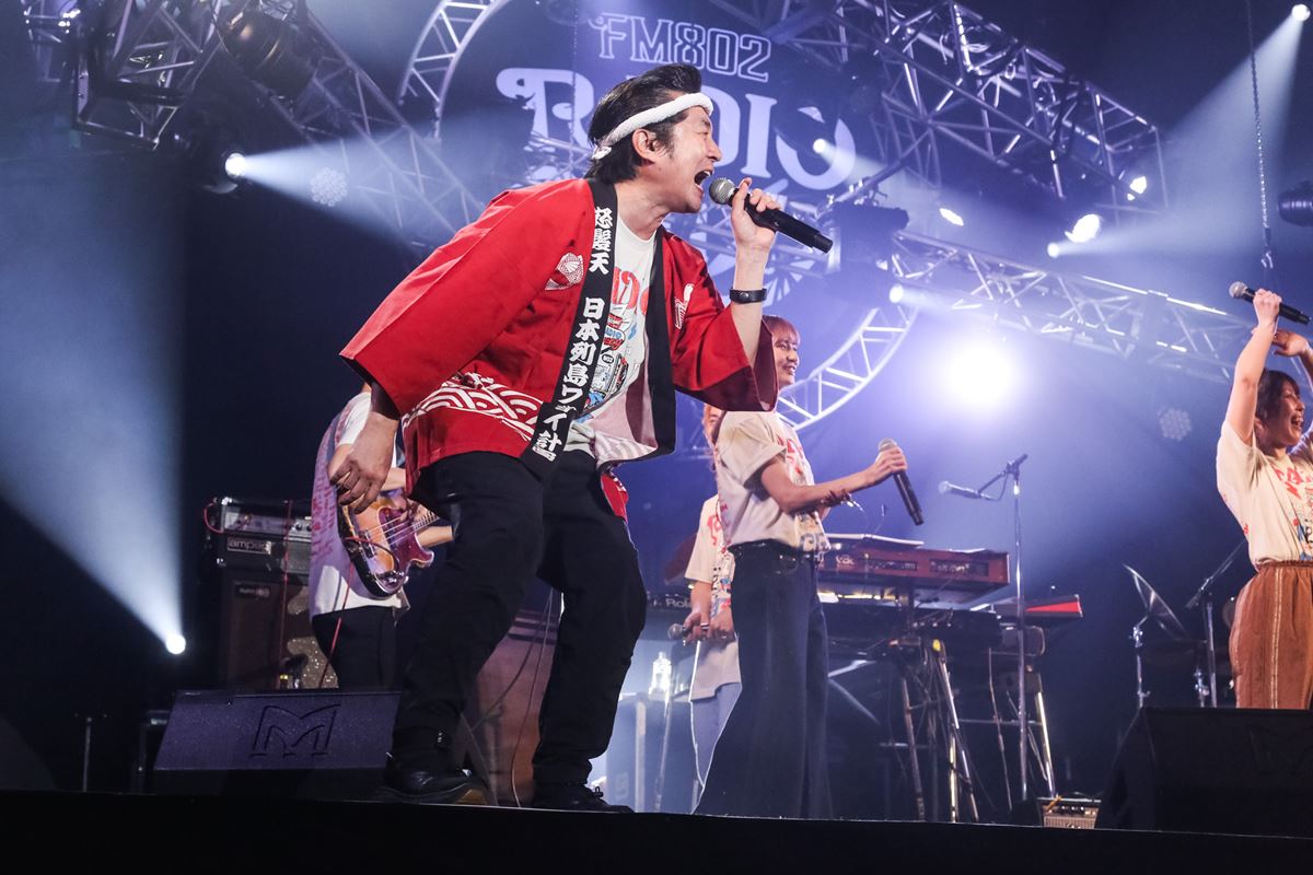 「始まりますよ、FM802&怒髪天 presents レディクレ歌合戦!」FM802のDJ・中島ヒロトの呼び込みを合図に、坂詰克彦(怒髪天)が叩く聴き覚えのあるリズムに乗り、マイクを手にした増子直純(vo)が、怒髪天の地元・北海道のヒーロー、北島三郎の「まつり」をソウルフルに歌いながら登場。<今年も本当にありがとう🎵>怒髪天の増子直純、上原子友康(g)、坂詰克彦(ds)、そしてサポートメンバーのフラワーカンパニーズ・グレートマエカワ(b)、SOUL FLOWER UNION・奥野真哉(key)を迎えたスペシャルなバンドが演奏を務める、ロックな歌合戦の始まりだ。