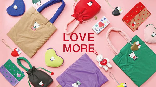 同時発売アイテムとして、トートバッグと対になる配色のふっくらと仕上げたハート型のポーチ(3色)や、ハートを抱っこしたクマちゃんが刺しゅうされた総柄のジャカード織りタオルハンカチ(2色)、ハートを抱っこしたクマちゃんのチャーム(5色)などかわいい雑貨アイテムも勢ぞろい。