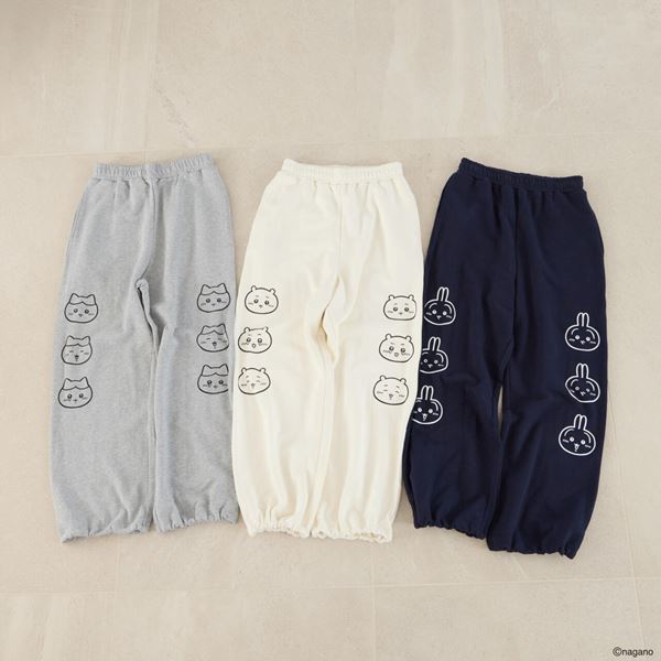 スウェットシリーズでは、ちいかわたちの後ろ姿を蛍光カラーの刺繍で表現したプルオーバーや、さまざまな表情をデザインしたパンツも登場!組み合わせて大人かわいいリラックスコーデが完成します♪