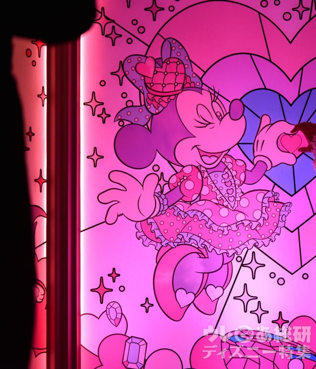 プラザのバナー上のハート型ステンドグラス仕様のランプがあったり、シンデレラ城裏のピンクのクリスタルとミニー像がキラキラ光ったり。