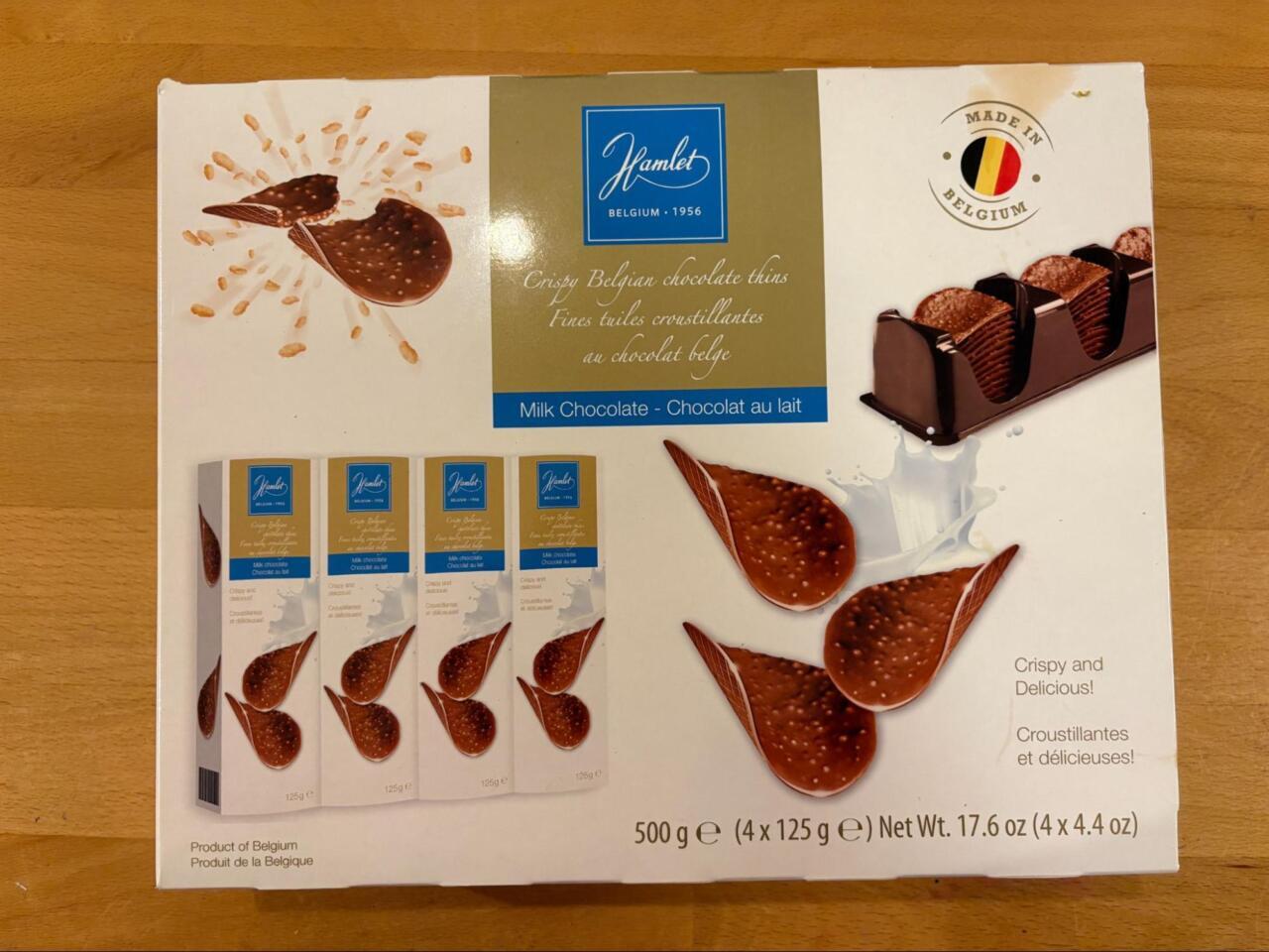 【ハムレット チョコクリスピー】ベルギー産の薄焼きチョコが4箱セットになったコストコ定番商品!パリッと軽い食感で、チョコレートなのに重たくなりにくいのが特徴です◎