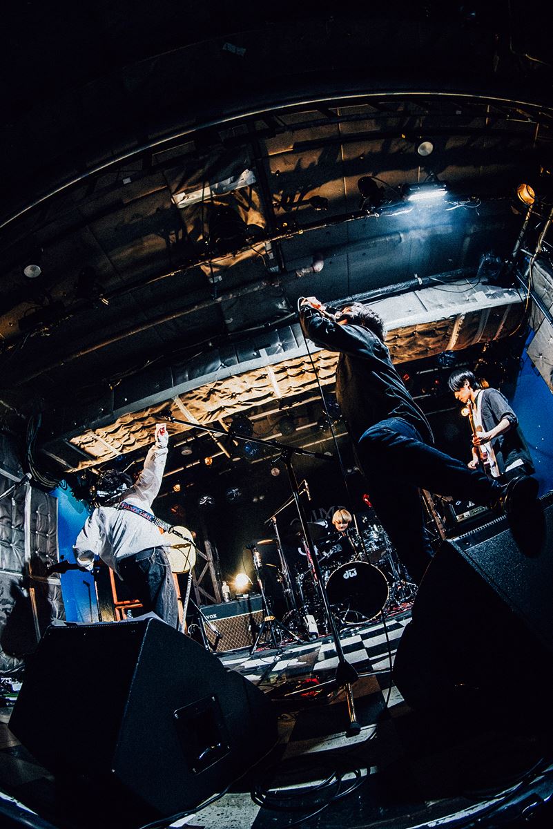 イワオリク(b/cho)のダイナミックなベースサウンドやヤマグチユウモリ(g/vo)のキラキラと輝くギターソロ、ナガマツシンタロウ(ds/cho)の重厚なドラム音が、会場のボルテージを上げていくような疾走感のある構成のセットリストが進んでいく。