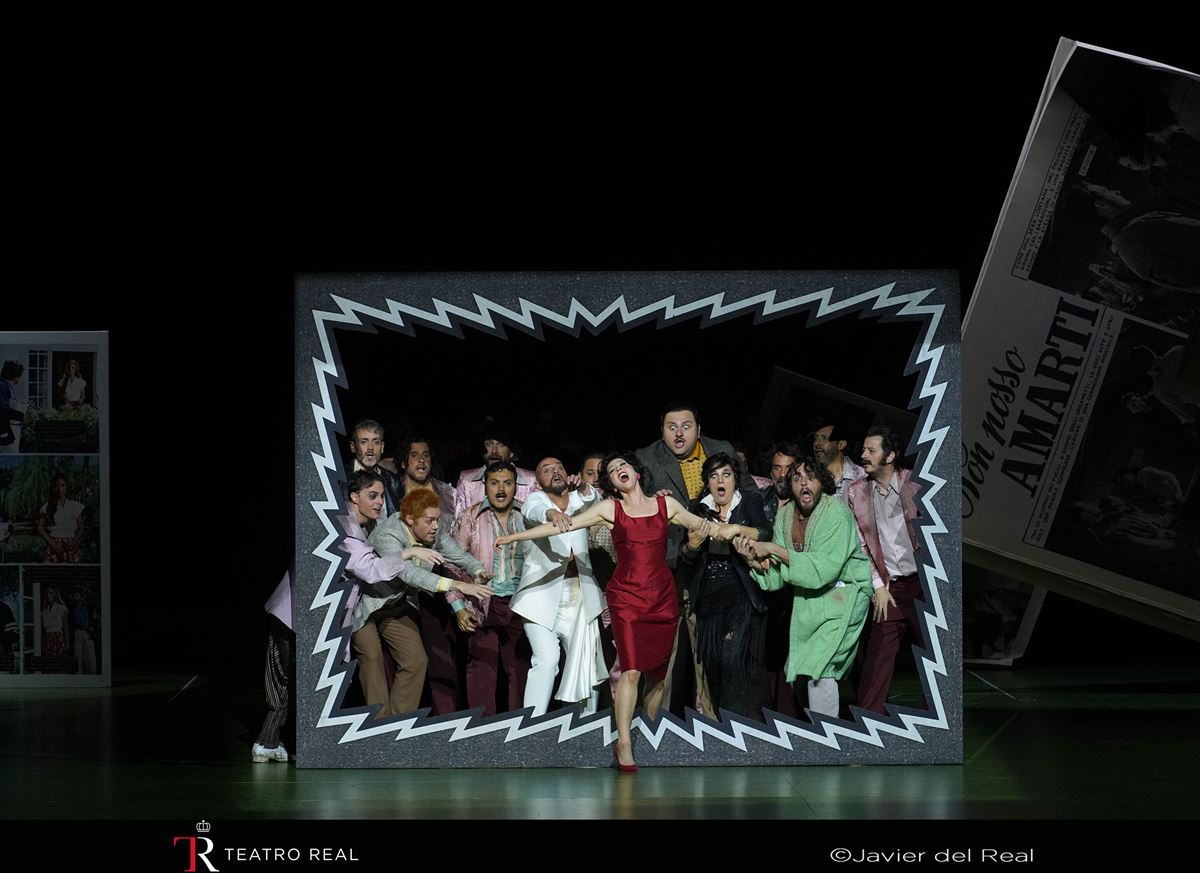 《イタリアのトルコ人》はもともと、オペラの題材を探す詩人が登場人物たちの騒動を観察し、それを台本へと仕立てる過程を物語に組み込んだ、メタシアター性を持っている。観客は、舞台で起きている出来事と、それが「作品」として形づくられていく視点とを同時に目撃することになる。そのメタシアター性をそのまま視覚化するかのように、舞台上の物語が巨大なフォトノベルとなって出現する模様。喜劇の妙味を洒脱に引き出してくれそうだ。