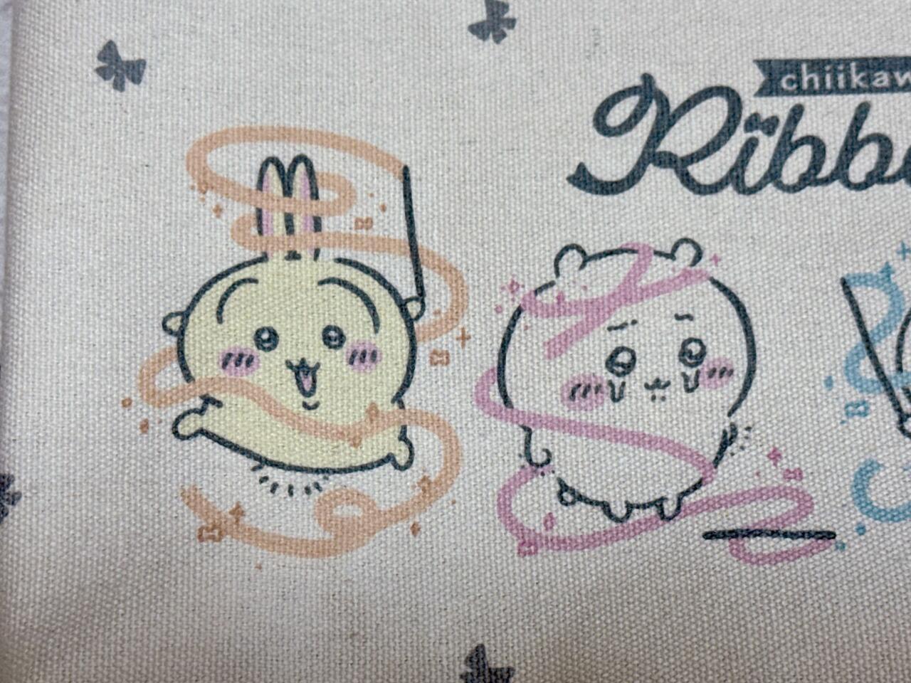 フロントには、ちいかわ・ハチワレ・うさぎ・モモンガが、まるで新体操の選手かのように、それぞれリボンをくるくる回しているイラストがプリントされています。筆者の記憶では初見のデザイン!特に、うまく回せず涙ぐんでいる不器用なちいかわがなんとも愛らしいイラストです。