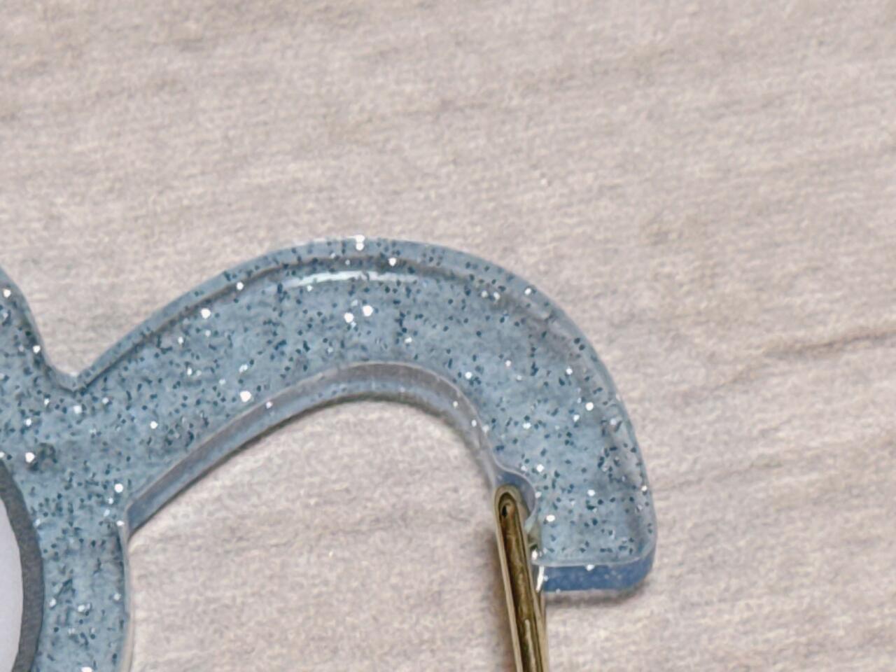 クリアブルーのアクリル素材に、シルバーラメがキラキラと輝くデザイン。カラビナ自体がリボン型になっており、見た目のかわいさも抜群です。