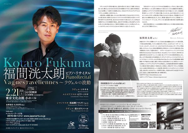 一昨年日本デビュー20周年を迎えたピアニストの福間洸太朗。2月21日(土)には東京文化会館小ホールで「ラヴェルの波動」と題したリサイタルを開く。最初、タイトルからオール・ラヴェル・プログラムを想像したのだが、そんな単純なものではない。前半にラヴェルの《ソナチネ》とルトスワフスキの《ピアノ・ソナタ》、後半にシマノフスキの《仮面劇(マスク)》とラヴェルの《夜のガスパール》。じつに練り込まれた、福間らしいレアな構成。福間に聞いた。