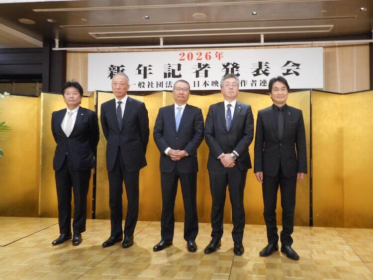 映連による新年記者発表会見の様子。左から高橋敏弘(松竹)、松岡宏泰(東宝)、島谷能成(映連 / 東宝)、吉村文雄(東映)、夏野剛(KADOKAWA)。