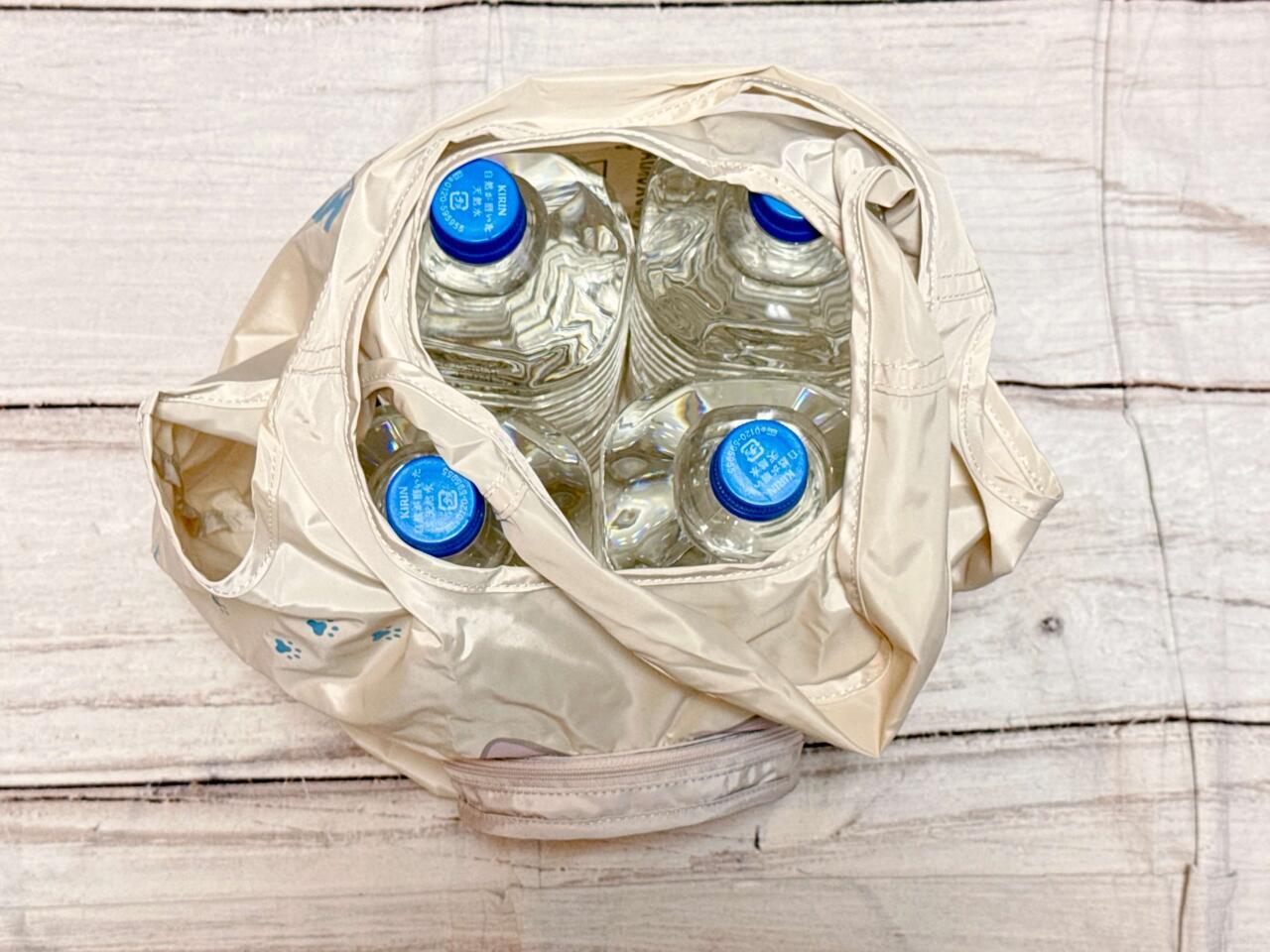 かわいいだけでなく、2Lペットボトルが4本入る大容量なのもうれしいポイント!持ち手が長めに設計されているため、厚手のアウターを着ていてもラクに肩がけできます。いつもバッグに忍ばせておきたい頼れる存在のエコバッグです♪