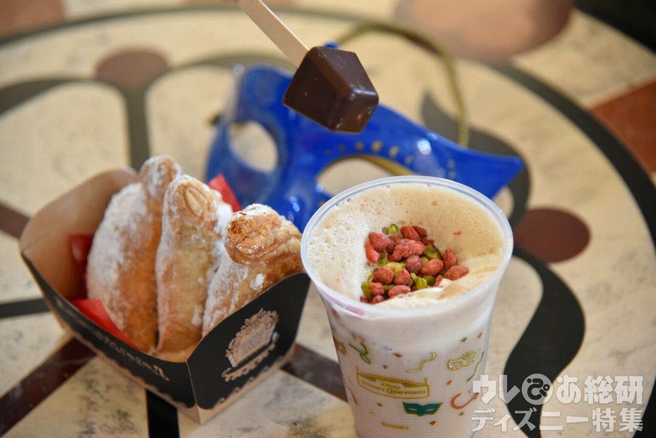 「ディズニーストーリービヨンド」メニュー/キアッケレ(コーヒー&マスカルポーネ)680円 ピスタチオとストロベリーのカフェモカ850円 © Disney