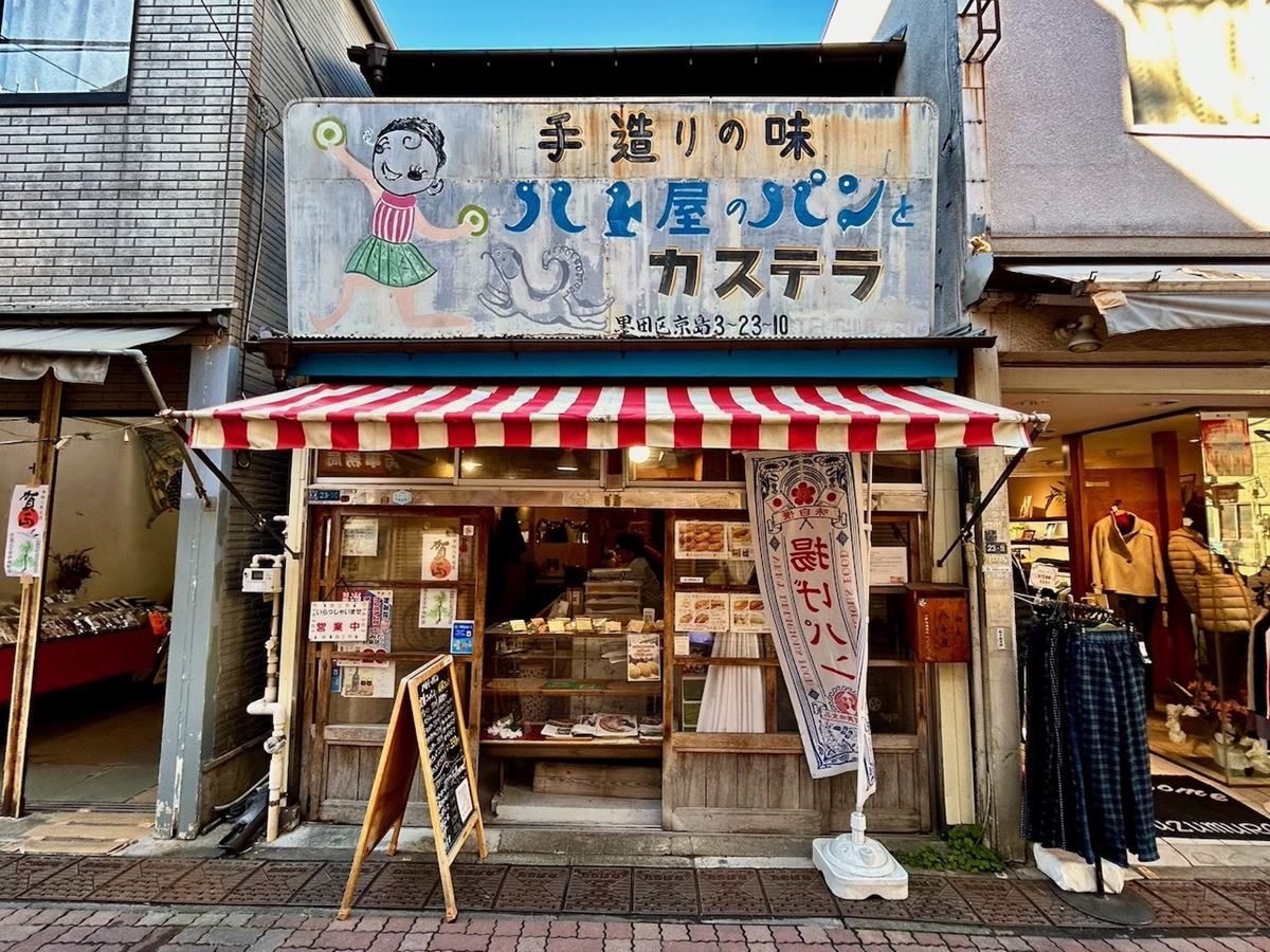 店は京成曳舟駅から徒歩7分の「下町人情キラキラ橘商店街 」のなかほどにあった。懐かしい佇まいと、風情がある看板が特徴のパン屋だった。看板には、ドーナツのようなものを持つ女の子と犬と「ハト屋のパンとカステラ」の文字が描かれている。