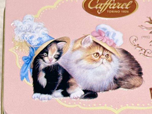淡いピンクカラーの缶に、ゴージャスなハットを被ったねこ2匹のイラストがあしらわれています。