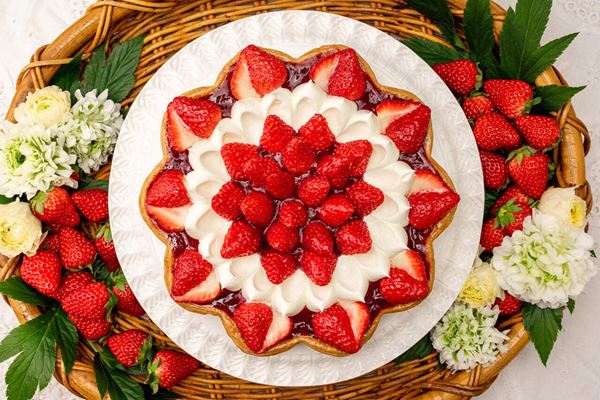 紅ほっぺとやさしい甘さのホワイトチョコチーズスフレを組み合わせた「輪花型 “紅ほっぺ”とホワイトチョコのチーズスフレタルト」は、タルトの形にも注目。