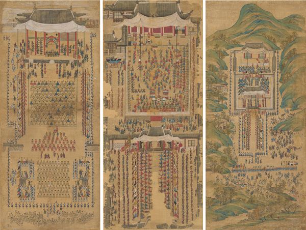 金得臣ほか筆《華城園幸図屛風》(右から 第1図 華城聖廟展拝図/第3図 奉寿堂進饌図/第4図 洛南軒養老宴図) 朝鮮時代・正祖19年(1795)