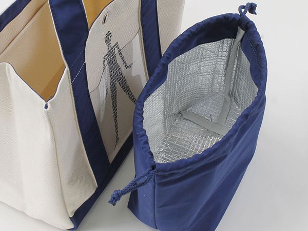 そして、このランチバッグの魅力は見た目だけではありません。付属の保冷巾着は内側にラミネート加工が施されており、ランチボックスなどを保冷しながら持ち運べる優れもの。巾着タイプなので出し入れもスムーズです。