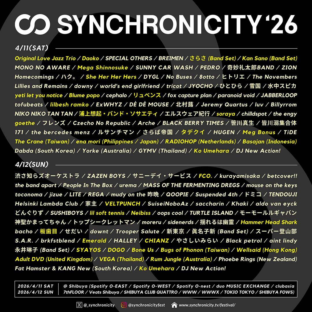 4月11日(土)、4月12日(日)に東京・渋谷にて開催の都市型フェスティバル「SYNCHRONICITY'26」の最終ラインナップが発表となった。
