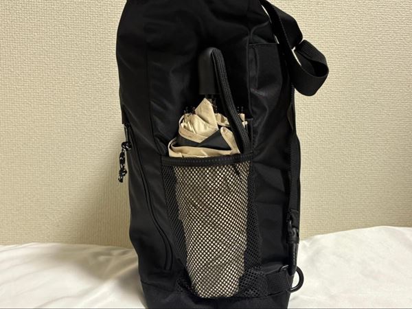 両サイドには約縦16×横12cmのメッシュポケットも付いていますよ。