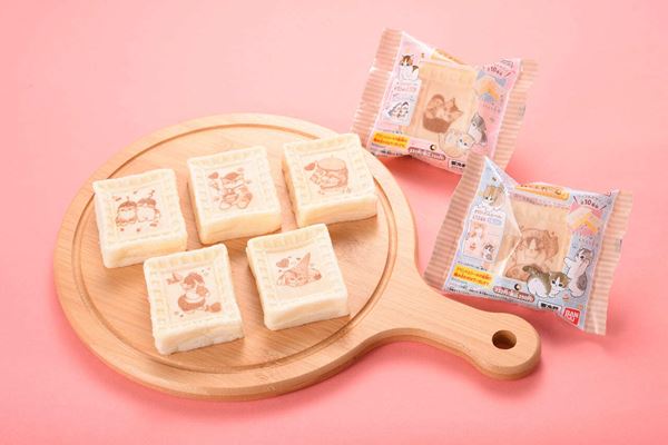 もちもち生地の四角いワッフルの中にカスタード味のクリームを入れた「mofusand わっふれ~む」は全12種類のオリジナルシールから1枚がランダムで入っています。