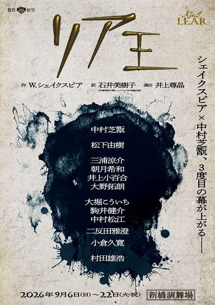 歌舞伎の立役として時代物、世話物、新歌舞伎など数多くの作品で当り役を持ち、映像作品でも活躍する芝翫が今回演じるのは孤独な王・リア王。その長女ゴネリル役には、TVドラマ『ナースのお仕事』シリーズ、『大奥〜第一章〜』や舞台『ブロードウェイ・バウンド』など、確かな演技力で幅広い役柄を演じる松下由樹。弟の策略に翻弄されるエドガー役は、映画『るろうに剣心』シリーズや、舞台『呪術廻戦』、『サド侯爵夫人』に出演する三浦涼介が演じる。